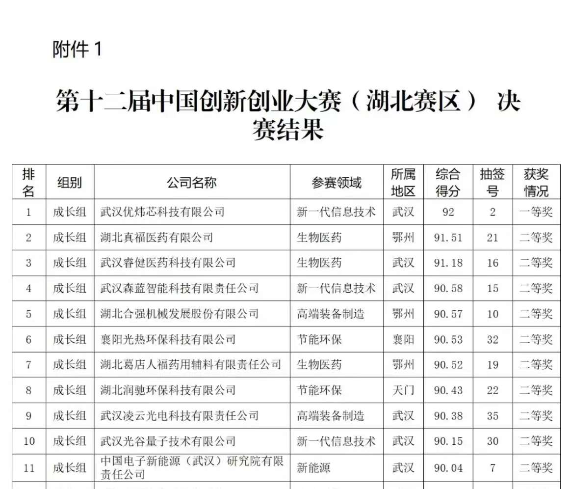 來(lái)自鄂州市的湖北真福醫(yī)藥有限公司、湖北合強(qiáng)機(jī)械發(fā)展股份有限公司、湖北葛店人福藥用輔料有限責(zé)任公司、湖北高碳光電科技有限公司、武漢萊爾特激光科技有限公司、湖北新德晟材料科技有限公司、武漢秋月吾同智能醫(yī)學(xué)影像有限公司分獲二、三等獎(jiǎng)。其中,湖北真福醫(yī)藥有限公司、湖北合強(qiáng)機(jī)械發(fā)展股份有限公司、湖北葛店人福藥用輔料有限責(zé)任公司、湖北高碳光電科技有限公司、武漢秋月吾同智能醫(yī)學(xué)影像有限公司入圍全國(guó)賽。